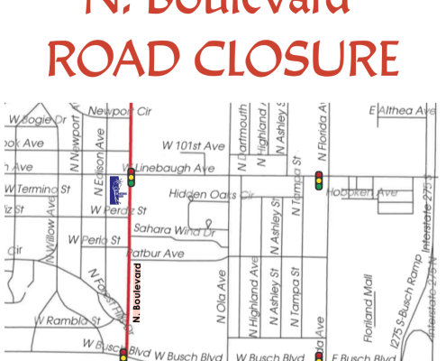 The City of Tampa plans to resurface N. Boulevard from Country Club Dr. to Waters Ave. starting on Monday, April 21. Consequently, sections of N. Boulevard will be closed to traffic as they work.