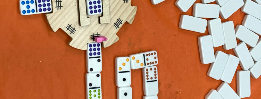 All aboard the Games Club train!   The current featured game is train dominoes.   No ticket or experience needed.