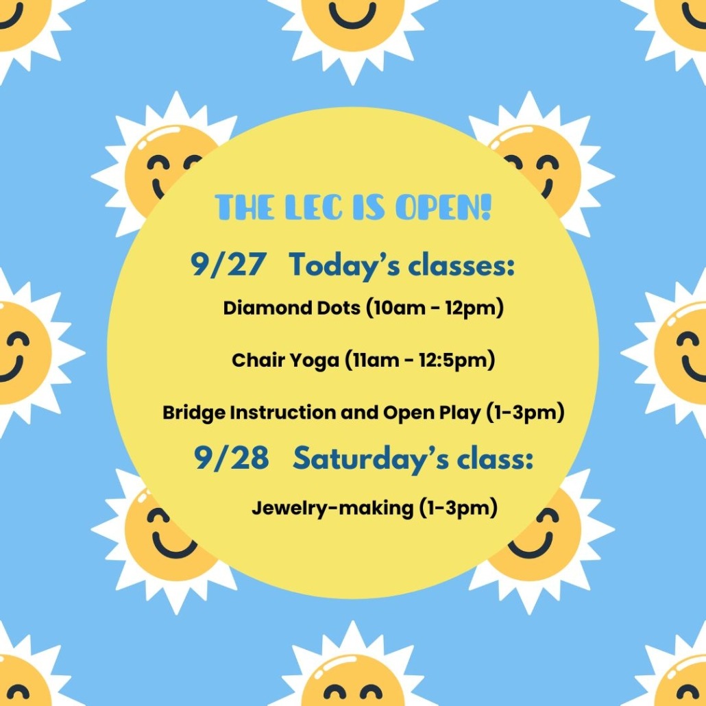 Announcements, LEC News, NewsLEC is OPEN!Hurricane Helene has passed, & the LEC is OPEN! Today’s classes: Diamond Dots (10am-12pm), Chair Yoga (11am-12:25pm), & Bridge Instruction/Open Play (1-3pm) Tomorrow’s classes: Jewelry-making (1-3pm) Join us! September 27, 2024/0 Comments/by jennifer@lectampa.org http://18.204.30.166/wp-content/uploads/2024/09/Due-to-Hurricane-Helene.jpg 1080 1080 jennifer@lectampa.org http://lectampa.org/wp-content/uploads/2026/01/lec_logo.png jennifer@lectampa.org2024-09-27 10:35:192024-09-27 10:35:19LEC is OPEN!