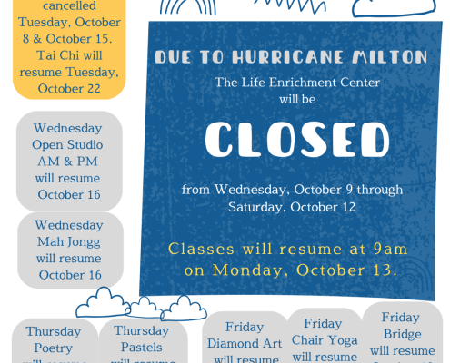 The Life Enrichment Center will be CLOSED Wednesday, November 26; Thursday, November, 27; and Friday, November 28. Classes & workshops will resume on Monday, December 1. FLORIDA STATE FAIR 2026 L.E.C. Entry Form/Fee Deadline EXTENDED TO…